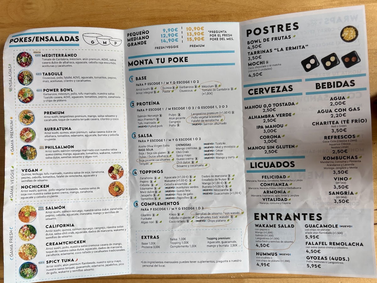 - Pokes Ensaladas: Indulge in the Poke Taboulé Couscous or the Mediterranean Premium Poke, showcasing the finest Cantabrian tomatoes and premium tuna.